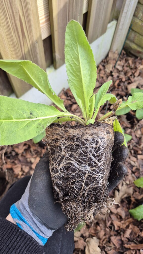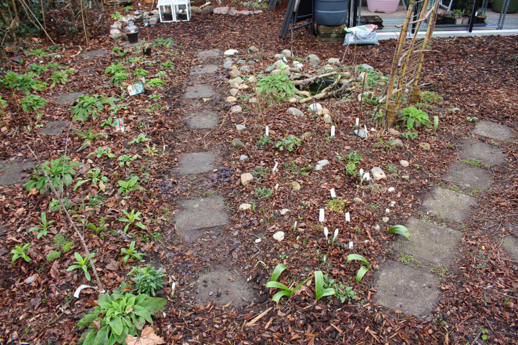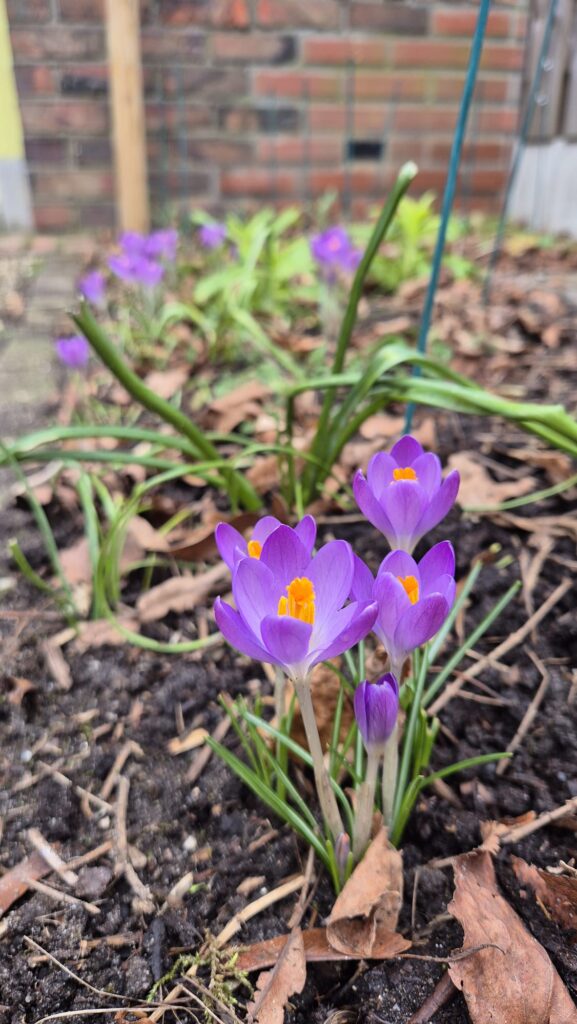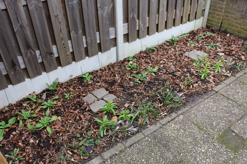De voortuin dient volledig als pluktuin voor boeketten. Deze vul ik met vroege bloeiers waarna ze plaats zullen maken voor zomerbloeiers. De eerste geluksvogels die uitgeplant werden zijn: vingerhoedskruid, mariëtteklokje, duizendschoon, straalscherm, damastbloem, bolderik en korenbloem. Deze hebben de hele winter buiten gestaan in P9-potjes, behalve mariëtteklokje, deze stond in de kas. Ik begreep van Eline van Bloem en Oogst, waar ik de zaden van heb, dat ze niet zo van natte voeten houdt. Ik had alle planten al in het najaar kunnen uitplanten maar destijds had ik mijn indeling nog niet klaar. Maar zo kan het ook! Terwijl ik ze aan het uitplanten was verschenen de eerste bloemen al aan de krokussen, prachtig! Die lentebloeiers die je begroeten in de tuin zijn een ware lift voor de geest.