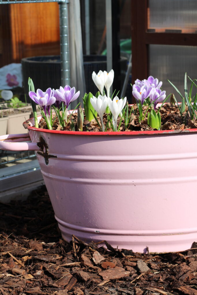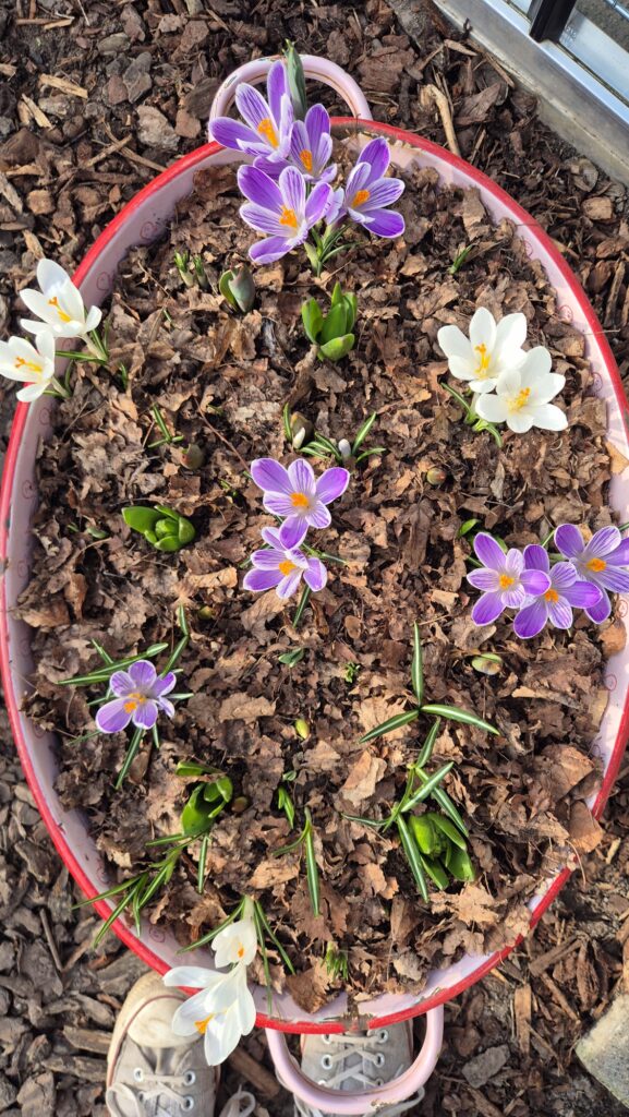 Over voorjaarsbollen gesproken. Ken je dat ook? Dat je ze in het najaar in de grond zet en vervolgens in het voorjaar vergeten bent waar? Ik zie overal wat opkomen maar weet dan niet direct meer wat wat is. Há, ik laat mij verrassen. En die sneeuwklokjes? Die schitteren bij mij in afwezigheid. Gelukkig wordt dit ruimschoots gecompenseerd door het flinke aantal wat wel boven komt. Nu zo eind februari hebben ze al een flinke groeispurt gemaakt. In het najaar maakte ik ook een bollenlasagne in een roze teil. Deze teil kreeg ik cadeau van Maria Aaldering, ze had mij geen beter cadeau kunnen geven! Ik ben er helemaal verzot op! Nu de krokussen bloeien en de hyacinten hun intrede doen is het een ware eyecatcher, met die leuke badeendjes langs de rand.