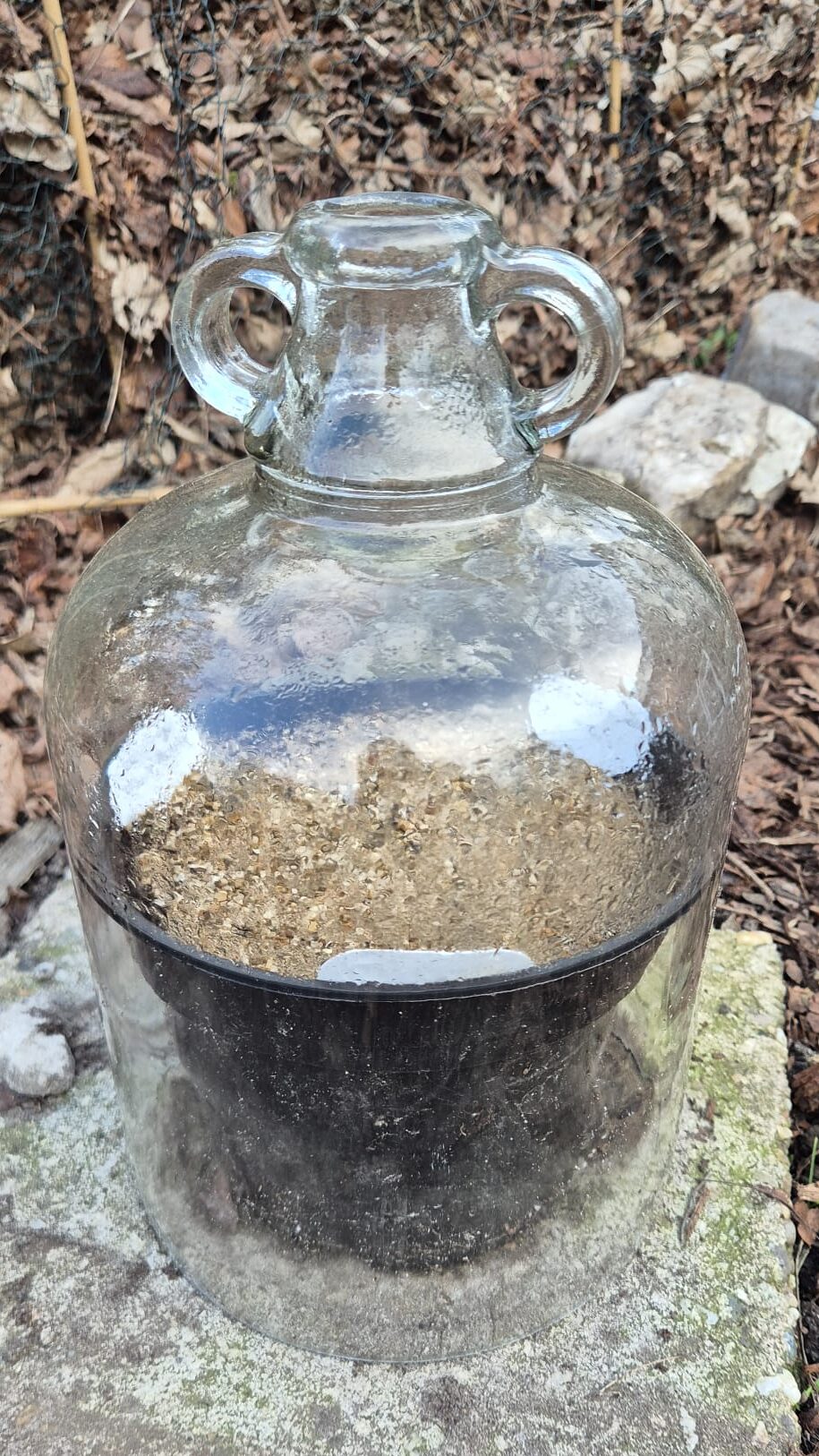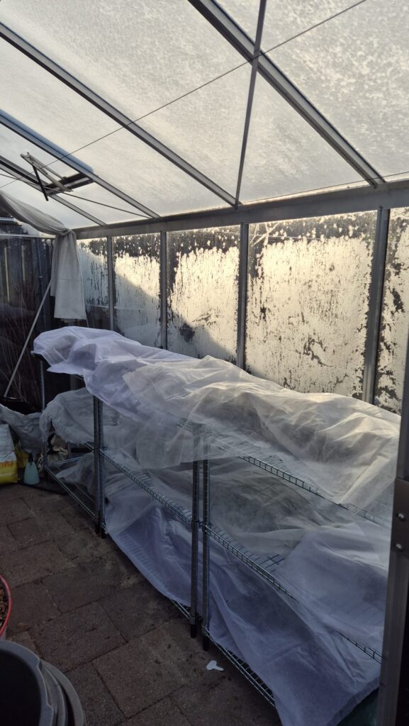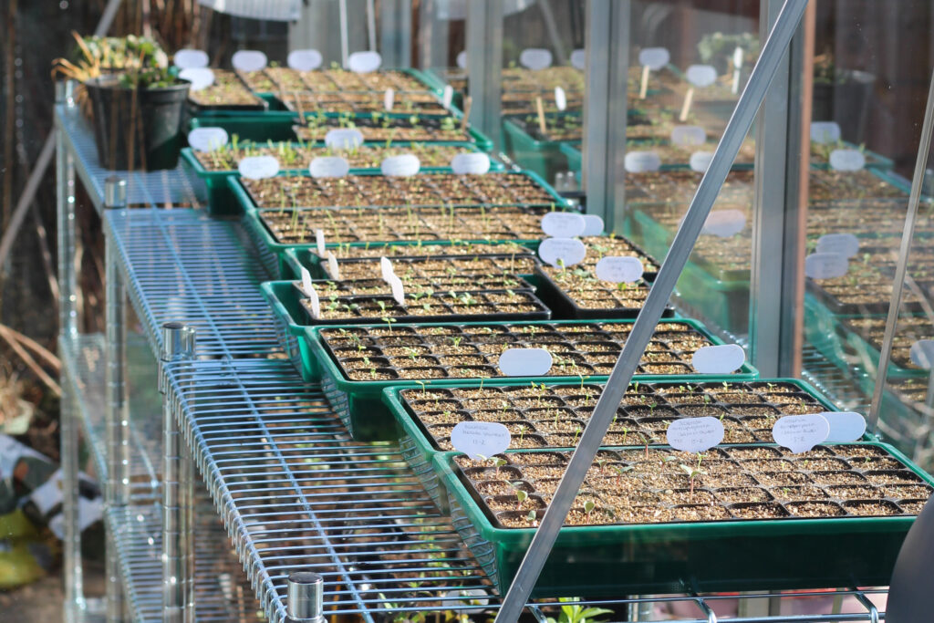 Daarnaast zaaide ik in in een C2 pot waarover ik de, erop lijkende, tuin cloché plaatste. Deze vond ik bij de kringloop! Ik zaaide fijn akkerscherm, eenjarige persicaria (kiss me over the garden gate) en wederom duizendblad! Net zoals in de P9-potjes is duizendblad inmiddels ontkiemd. Ik ben wel echt enthousiast over deze vondst! Het bootst precies het effect na van winter sowing in melkflessen en diepvrieszakken (lees vorige blog). Het glas is niet bezweken onder de vorst. Regen dringt binnen via het gat aan de bovenkant. De grond is nog steeds goed vochtig en met de zon erop zie je veel condens op het glas. Deze druppelt weer naar beneden waardoor de grond vochtig blijft. Water geven zit er dus, zelfs na zo’n zonnige laatste week van februari, nog niet bij!