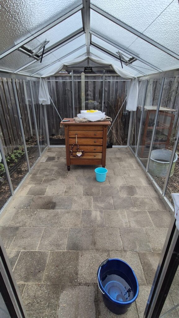 Zo ook de kriebels voor de tijd die komen gaat. Om deze fris tegemoet te gaan kwamen twee lieve vriendinnen en mijn geweldige moeder mij helpen met het leeghalen, schoonmaken en weer inrichten van de kas. Ik moet bekennen dat ik zelf niet erg opruimerig en geordend ben. Mijn brein is nogal chaotisch, handig he? Gelukkig beschikken mensen in mijn omgeving wel over deze talenten en heb ik het geluk dat ik daarvan mag profiteren. Poh! Wat een heerlijke dag was dat! De zon was ruimschoots aanwezig, we lunchten voor het eerst weer samen buiten en het voelde alsof we een vakantiedag hadden. Zo kunnen ‘vervelende’ klusjes ineens omgetoverd worden tot een gezellig samenzijn met ontzettend veel gelach. Sta je in de kas te boenen en dan drukt een vriendin ineens vol haar gezicht tegen de ruit. STUK!