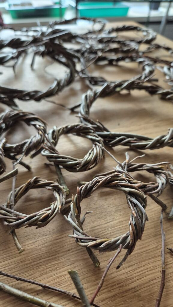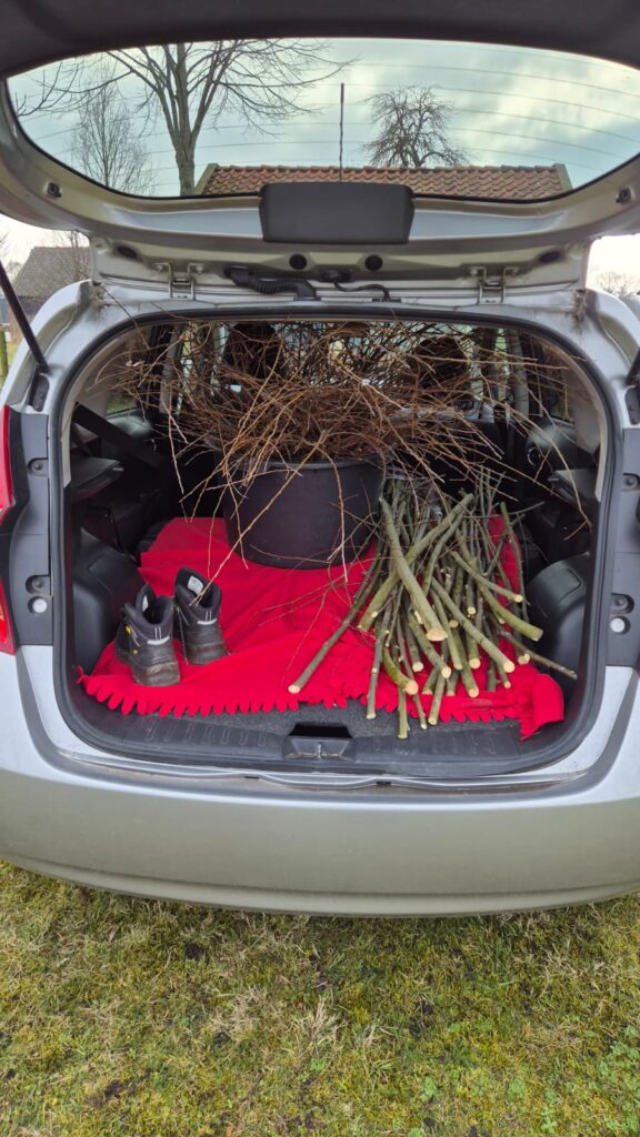 Het was niet alleen tijd om te zaaien maar ook het tijdperk van gratis wilgentakken verzamelen diende zich aan. Dit keer hoefde ik geen bogen of hekjes te maken. Ik had een ander doel, namelijk takken verzamelen voor het maken van kransen. Via Marktplaats kwam ik terecht op een boerenerf in Ambt Delden waar ik vriendelijk ontvangen werd. Ik kreeg alle tijd en ruimte om de benodigde takken te verzamelen. Ik snoepte ook nog wat extra takken mee waar ik constructies voor plantensteunen mee kan maken. Ik wil namelijk in de voortuin geen plastic netten meer, al waren deze zeker wel handig. Handig, maar niet om aan te zien en het blijft plastic. Binnenkort ga ik beginnen met het maken van de eerste constructies. Zo ook bij de regenton, waar ik een klimconstructie voor wil maken. Vanuit het terras kijk ik dan tegen groen aan in plaats van de grauwe grijze regenton bij de kas.